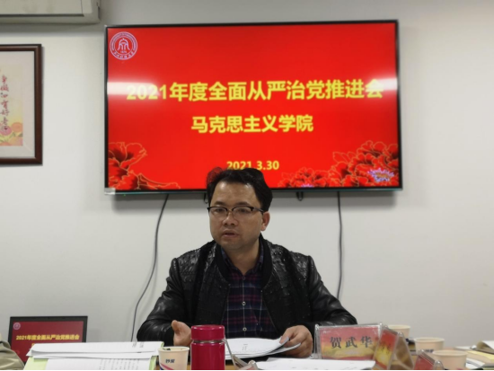 贺武华强调学院党委要结合马院特点认真贯彻落实校党委全面从严治党工作会议精神,把全面从严治党工作要点落到实处。一是要提高政治站位,必须始终坚持以习近平新时代中国特色社会主义思想为指导,坚决做到“两个维护”,树立“四个自信”。 二是要压实党委主体责任、第一责任人责任、党政同责、一岗双责,做到守土有责、守土担责、守土尽责。三是要严格落实意识形态工作责任,增强阵地意识,坚决做到马院姓马、在马言马、在马研马,坚定马克思主义理想信念。四是要加强党风廉政建设,加强以案促改警示教育,营造风清气正的政治生态。五是要加强制度建设,严肃组织生活,按照上级相关文件和精神,不断实现支部建设规范化、标准化。