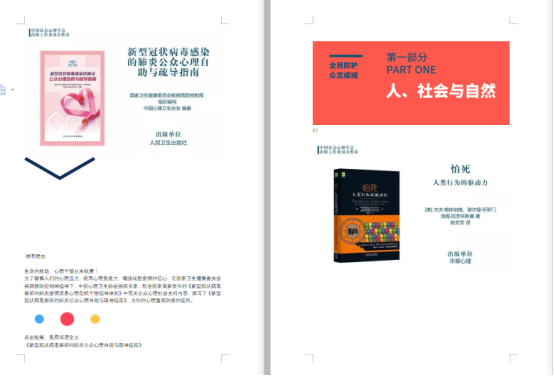 为了增加同学们的积极体验,增强同学们的情感共鸣,强化每一个人对“全国人民幸福共同体”的群体认同,心理课程中适度增加了最富有艺术感染力的音乐元素,例如一首纯音乐歌曲《光》的分享。另外,旨在延展同学们对于课程内容的认知边界,进一步巩固线上教学“全科视角”的教育效果,同时做好防疫“第二战线”上的政策解读、舆论引导、心理疏导等思想政治工作,一份详尽的书单提供了较为全面且专业的能力提升通道,包括全国卫健委组织编制的《新型冠状病毒感染的肺炎公众心理自助与疏导指南》、中国心理学会推荐的读物《人生学校》、《象与骑象人》、《控制焦虑》、《乌合之众》、《枪炮、病菌与钢铁:人类社会的命运》等。