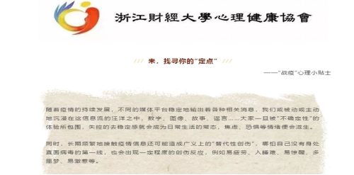 根据疫情防控时期的特点,周浩老师写成一篇“战疫”心理小贴士《来,寻找你的定点》通过浙财心协微信公众号平台“学源街解忧杂货铺“与同学们进行分享,以传播正确的心理调节方式,激活师生精神层面的自我防护潜能。除了建立一个互相为伴的支持共同体以外,心理贴士的分享更多是为了在信息冗余的网络平台上介绍一些特殊时期的心理现象和应对贴士,希冀提供简约明了且有针对性的帮助。其中,对于“不确定性”、“替代性创伤”、“应激状态”、“情绪消耗”等内容的介绍直接引出“寻找定点”的重要性,提供了屏蔽消息、关注当下、建立系统、拒绝偏面等应该方案。