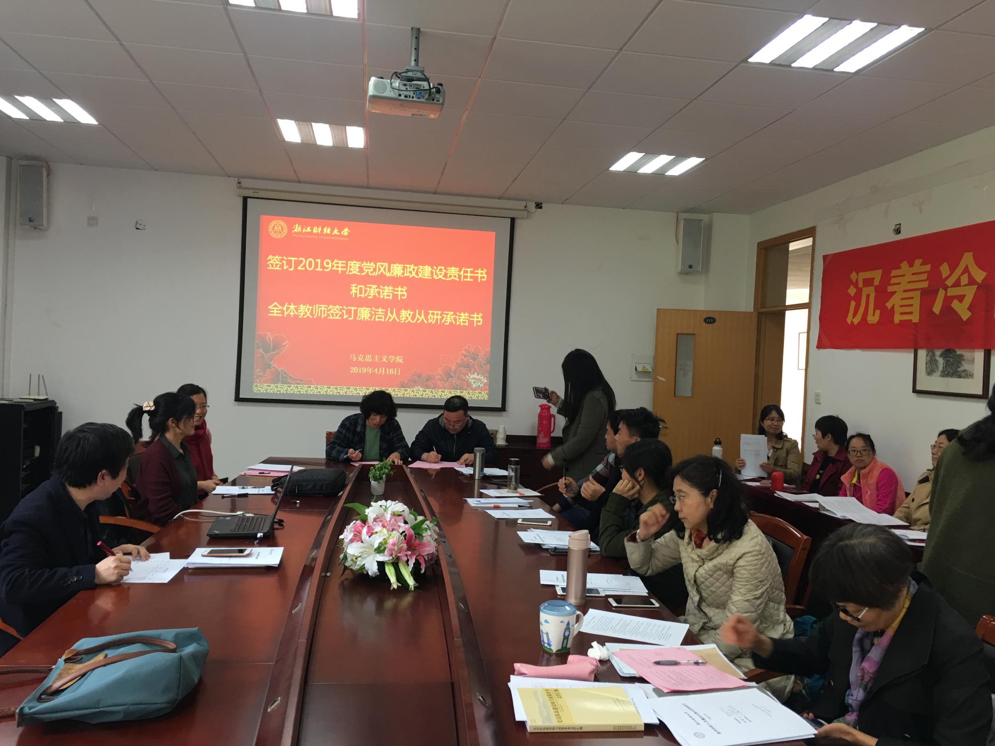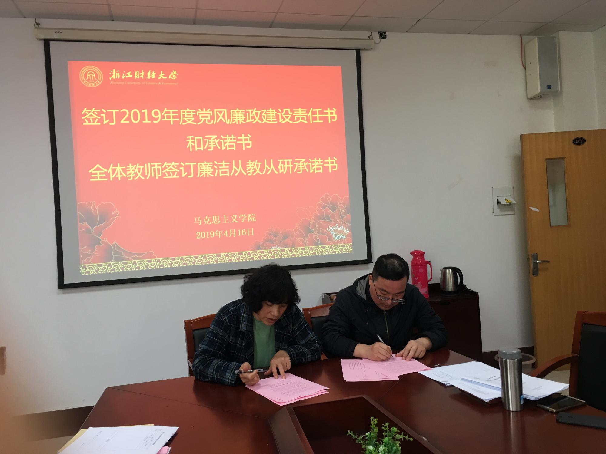 教学科研人员廉洁从教从研承诺书》。学院中层干部签订了廉洁自律承诺书,全体教师签订了廉洁从教从研承诺书。