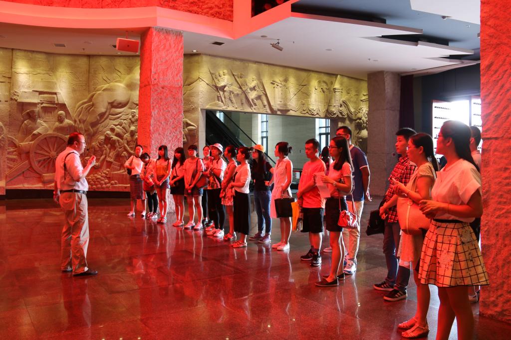 在党旗的引导下,同学们进入了一幢石库门房子,受到了李馆长的亲自接待,开始了一天的精神洗礼。李馆长详细介绍了中国共产党早期创建史,还带领他们观看了一系列生动的宣传图片和详实的文字记载资料以及以中国共产党诞生的曲折历史为题材的影视宣传片,使大家真切感受到了中国共产党诞生及其发展的曲折历史;接着李馆长又展示了珍贵的历史文物:一手的文献资料,如《新青年》《少年中国》《红星耀中国》等,日军早期钢盔和8年抗战一直使用的手枪等;最后,华正学主任画龙点睛,将此次参观与学生今后的学习生活联系起来,教导学生用红船精神激励专业梦。
