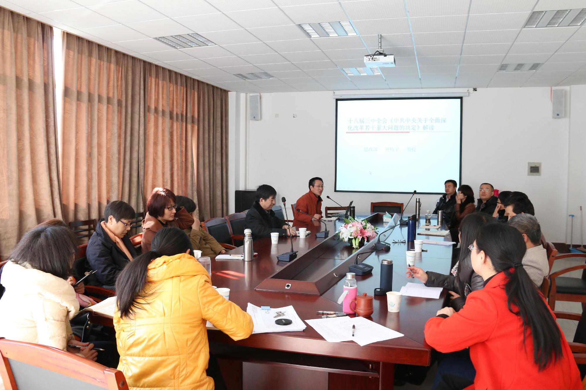 12月10日下午,思政部在3号学院楼211会议室召开学习宣传十八届三中全会精神辅导报告会,思政部党总支副书记、副主任何历宇教授作题为十八届三中全会《中共中央关于全面深入改革若干重大问题的决定》解读的报告会,思政部全体教职工参加大会,思政部主任华正学教授主持会议。