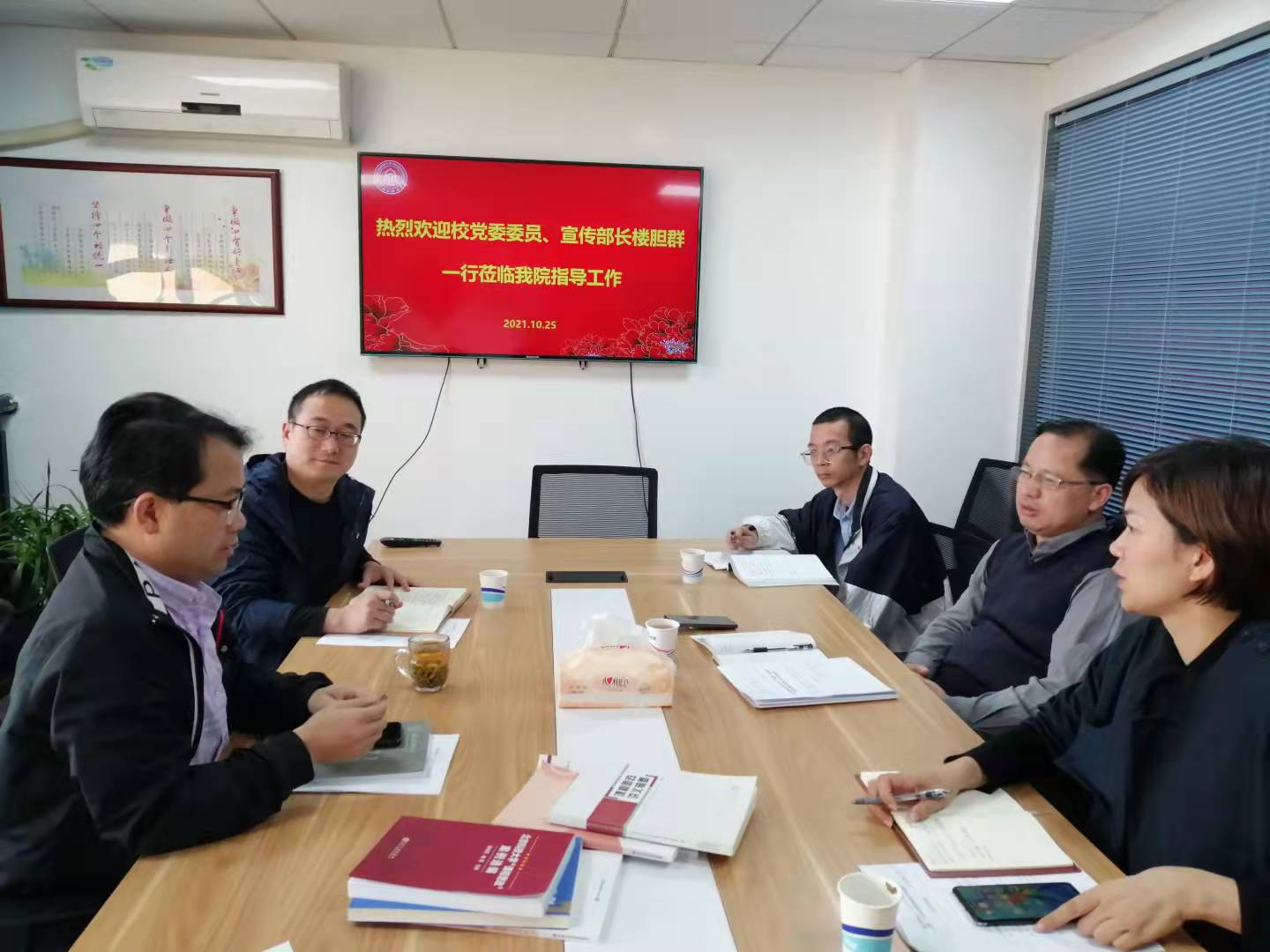 10月25日下午,学校党委委员、宣传部长楼胆群,宣传部副部长毛鸽等一行来到肉番