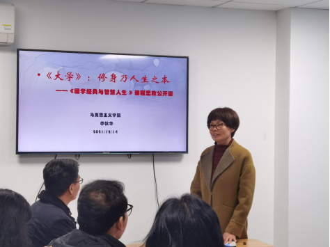 《国学经典与智慧人生》课程负责人李秋华老师讲授的是国学“四书五经”之首《大学》内容,她在教学上融入了“课程思政”教学形式要求,简要介绍四书,接着详细讲解《大学》的“三纲”“八目”即“明徳、亲民、止于止善”及“格物、致知、诚意、正心、修身、齐家、治国、平天下”,最后是安排学生结合实际生活开展讨论环节。