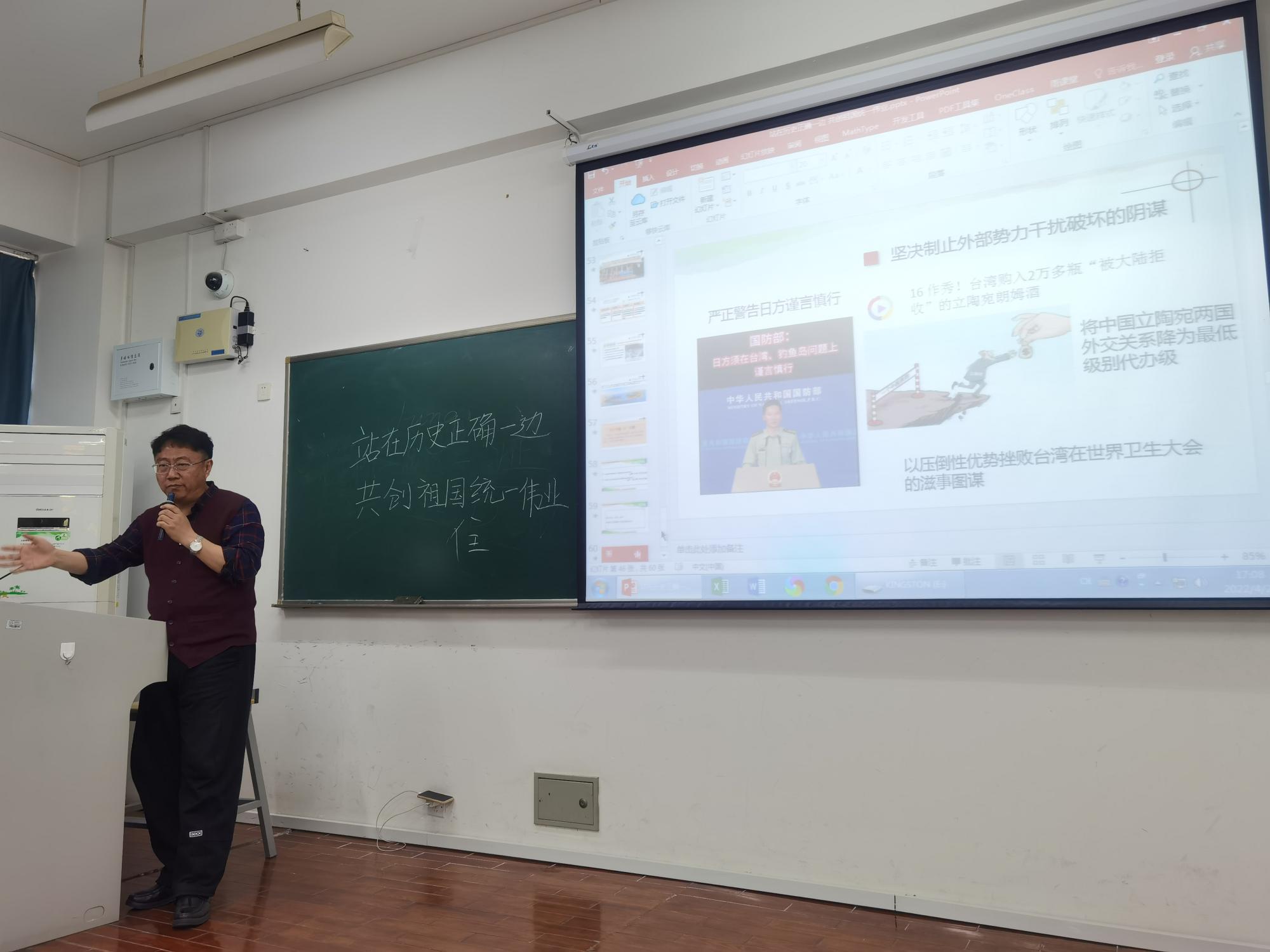 副校长李占荣结合自身专业以及过往的台湾调研与学术交流经历,以“站在历史正确一边,共创祖国统一伟业”为题,为法学院学生讲授了“台独”的本质和危害,分析了为什么祖国必须统一和统一是历史发展的必然。