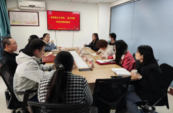 在3号楼517A会议室开展“手拉手”集体备课活动。活动邀请我院资深教授何历宇、潘旦、青年教师王聪介绍课程建设经验,东方学院马院党委书记叶颖蕊,思政课教师吕欢、白云浩、钱潇荣,教学秘书马羚以及肉番