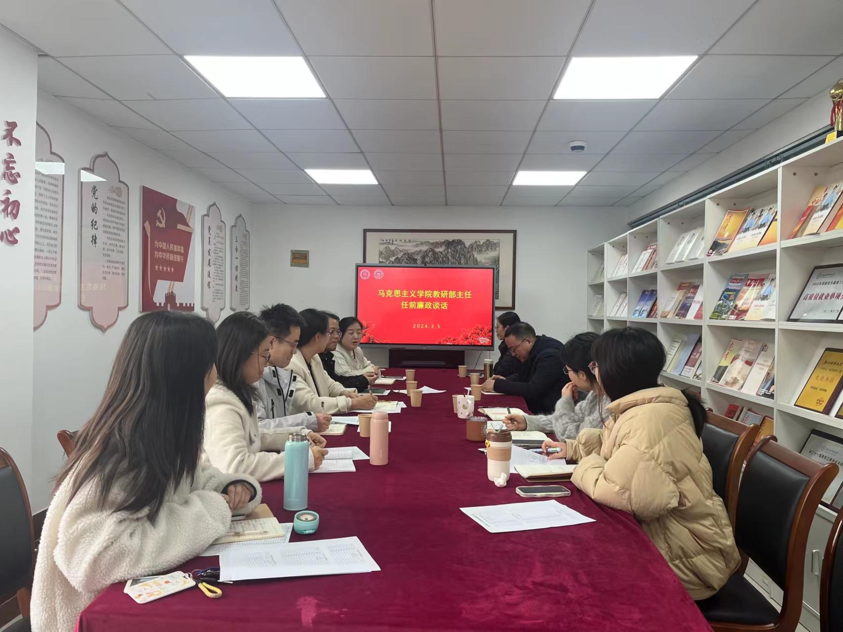 对新任教研部主任、副主任进行任前廉政谈话。学院书记高燕,院长贺武华、纪委书记邢雁欣,分别围绕教研部主任进一步提高政治站位、增强责任意识、忠诚干净担当作为、时刻做到廉洁自律四个方面对与会人员进行了集体廉政谈话。