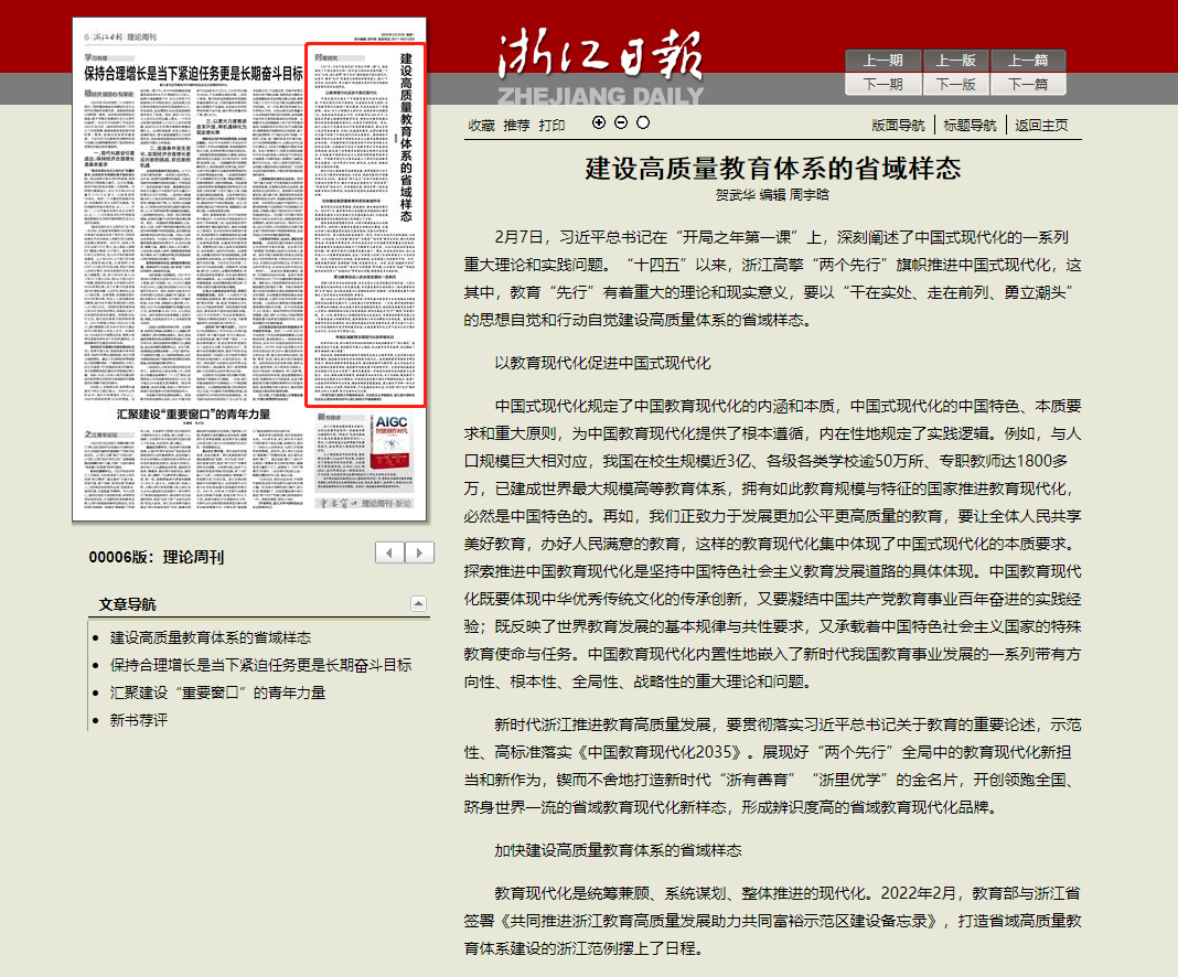 教育现代化是统筹兼顾、系统谋划、整体推进的现代化。2022年2月,教育部与浙江省签署《共同推进浙江教育高质量发展助力共同富裕示范区建设备忘录》,打造省域高质量教育体系建设的浙江范例摆上了日程。